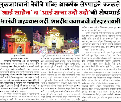 महाराष्ट्राची कुलस्वामिनी आई श्री तुळजाभवानी मातेचा शारदीय नवरात्र उत्सव जवळ असल्याने मंदिर प्रशासनासह नगर परिषद व पोलीस विभागाची तयारी जोरात सुरू आहे. दरवर्षीप्रमाणे नवरात्र उत्सवात तुळजाभवानी देवीच्या राजे शहाजी महाराज व जिजाऊ महाद्वार यासह मंदिरावर आकर्षक विद्युत रोषणाई करण्यात आली आहे. देवीच्या महाद्वारावर ‘आई साहेब’ व ‘आई राजा उदो उदो’ असे विविध आकर्षक रोषणाईने लिहले आहे. तुळजाभवानी व तुळजापूर मंदीर हे रोषणाईने नटले असुन ही आकर्षक रोषणाई कॅमेरात कैद करण्यासाठी व पाहण्यासाठी भक्तांची मोठी गर्दी होत आहे. मंदिर समोरील भाग हा सध्या सेल्फी पॉईंट ठरत आहे.