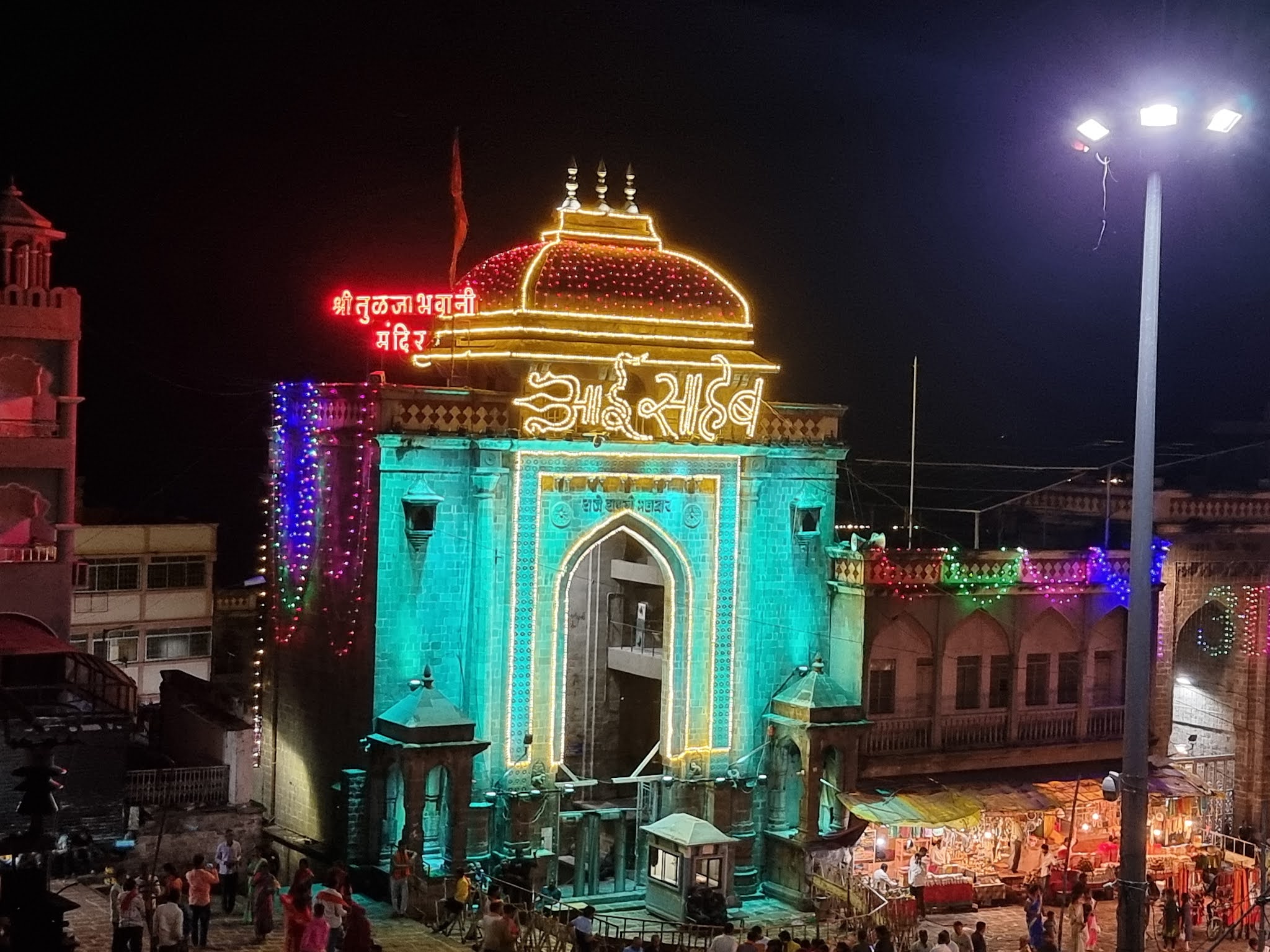 महाराष्ट्राची कुलस्वामिनी आई श्री तुळजाभवानी मातेचा शारदीय नवरात्र उत्सव जवळ असल्याने मंदिर प्रशासनासह नगर परिषद व पोलीस विभागाची तयारी जोरात सुरू आहे. दरवर्षीप्रमाणे नवरात्र उत्सवात तुळजाभवानी देवीच्या राजे शहाजी महाराज व जिजाऊ महाद्वार यासह मंदिरावर आकर्षक विद्युत रोषणाई करण्यात आली आहे. देवीच्या महाद्वारावर ‘आई साहेब’ व ‘आई राजा उदो उदो’ असे विविध आकर्षक रोषणाईने लिहले आहे. तुळजाभवानी व तुळजापूर मंदीर हे रोषणाईने नटले असुन ही आकर्षक रोषणाई कॅमेरात कैद करण्यासाठी व पाहण्यासाठी भक्तांची मोठी गर्दी होत आहे. मंदिर समोरील भाग हा सध्या सेल्फी पॉईंट ठरत आहे.