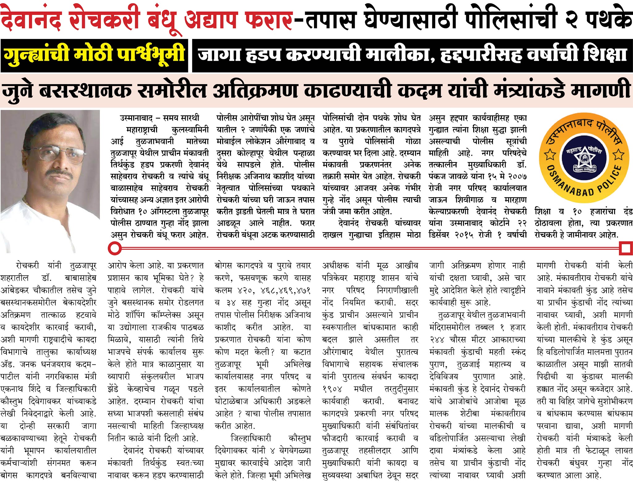 महाराष्ट्राची कुलस्वामिनी आई तुळजाभवानी मातेच्या तुळजापूर येथील प्राचीन मंकावती तिर्थकुंड हडप प्रकरणी देवानंद साहेबराव रोचकरी व त्यांचे बंधू बाळासाहेब साहेबराव रोचकरी यांच्यासह अन्य अज्ञात इतर आरोपी विरोधात 10 ऑगस्टला तुळजापूर पोलीस ठाण्यात गुन्हा नोंद झाला असुन रोचकरी बंधू फरार आहेत. पोलीस आरोपींचा शोध घेत असून यातील 2 जणांपैकी एक जणांचे मोबाईल लोकेशन औरंगाबाद व दुसरा कोल्हापूर येथील पन्हाळा येथे सापडले होते. पोलीस निरीक्षक अजिनाथ काशीद यांच्या नेतृत्वात पोलिसांच्या पथकाने रोचकरी यांच्या घरी जाऊन तपास करीत झडती घेतली मात्र ते घरात आढळून आले नाहीत. फरार रोचकरी बंधूना अटक करण्यासाठी पोलिसांची दोन पथके शोध घेत आहेत. या प्रकरणातील कागदपत्रे व पुरावे पोलिसांनी गोळा करण्यावर भर दिला आहे. दरम्यान मंकावती प्रकरण नंतर अनेक तक्रारी समोर येत आहेत. रोचकरी यांच्यावर आजवर अनेक गंभीर गुन्हे नोंद असून पोलीस त्याची जंत्री जमा करीत आहेत. देवानंद रोचकरी यांच्यावर दाखल गुन्ह्याचा इतिहास मोठा असुन हद्दपार कार्यवाहीसह एका गुन्ह्यात त्यांना शिक्षा सुद्धा झाली असल्याची पोलीस सूत्रांची माहिती आहे. नगर परिषदेचे तत्कालीन मुख्याधिकारी डॉ पंकज जावळे यांना 15 मे 2007 रोजी नगर परिषद कार्यलयात जाऊन शिवीगाळ व मारहाण केल्याप्रकरणी देवानंद रोचकरी यांना उस्मानाबाद कोर्टाने 22 डिसेंबर 2015 रोजी 1 वर्षाची शिक्षा व 10 हजारांचा दंड ठोठावला होता , त्या प्रकरणात रोचकरी हे जामीनावर आहेत.