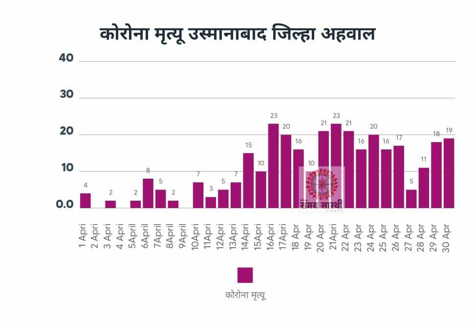उस्मानाबाद जिल्ह्यात मे महिन्यात पहिले 2 मृत्यू झाले त्या महिन्यात मृत्युदर 2.94 टक्के होता. जून 20 मध्ये सर्वाधिक 6.09 टक्के, जुलै महिन्यात 4.57 टक्के, ऑगस्ट 2.07, सप्टेंबर 3.49, ऑक्टोबर महिन्यात कोरोनाची पहिली लाट पीक मध्ये असताना 5.95 टक्के, नोव्हेंबर महिन्यात 4.30 टक्के,डिसेंबर 0.51 तर जानेवारी 2021 मध्ये एकही मृत्यू नव्हता, फेब्रुवारी 1.84 टक्के , मार्च महिन्यात 0.46 टक्के तर एप्रिल महिन्यात मृत्युदर हा 1.83 टक्के असा राहिला.