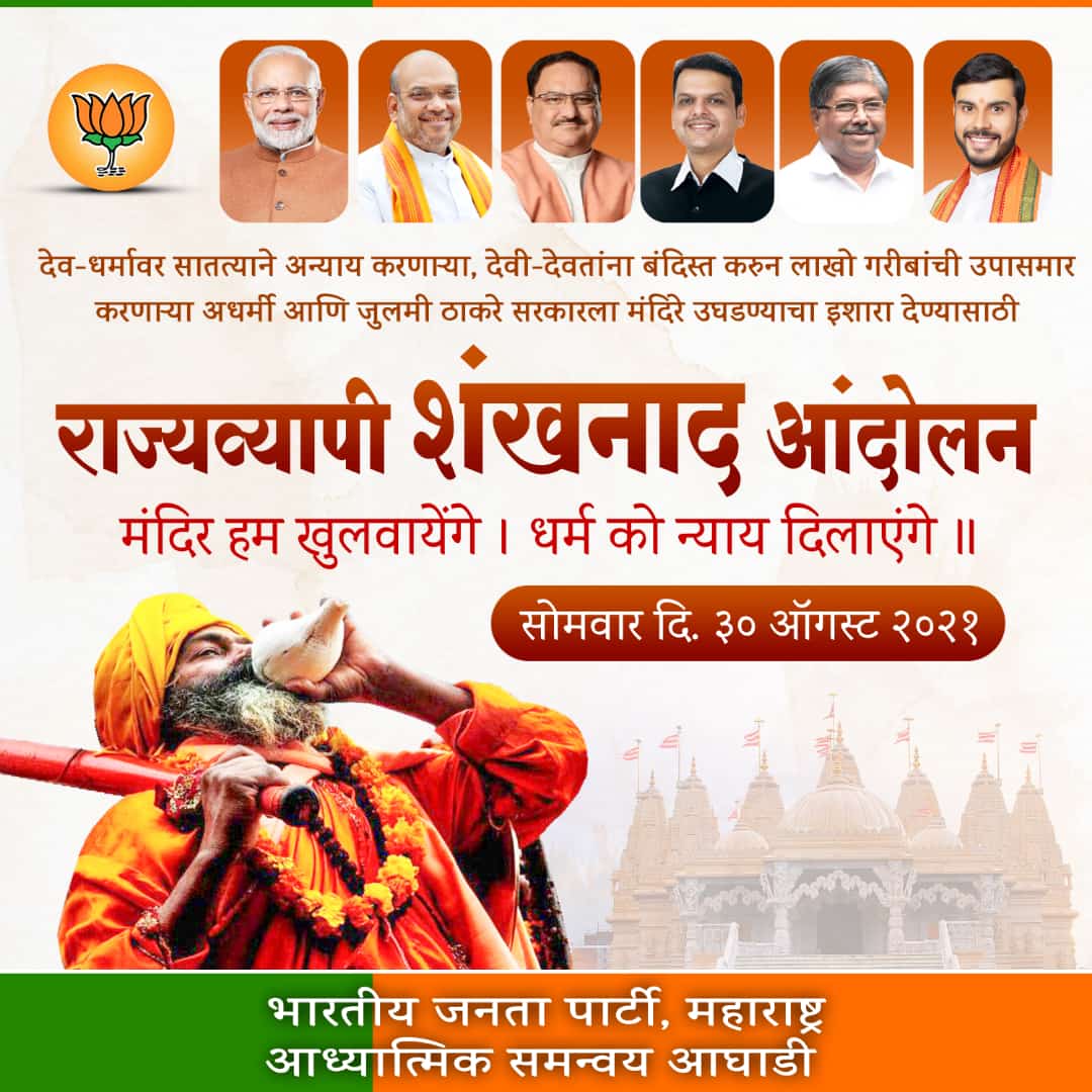 देव धर्मावर सातत्याने अन्याय करणाऱ्या , देवी देवतांना बंदिस्त करून लाखो गरिबांची उपासमार करणाऱ्या अधर्मी आणि जुलमी ठाकरे सरकारला मंदिर उघडण्याचा इशारा देण्यासाठी हे शंखनाद आंदोलन असल्याचे भाजपने जाहीर केले आहे.राज्यातील विविध मंदिरासमोर हे आंदोलन होणार आहे.कसबा गणपती पुणे येथे चंद्रकांत पाटील,रामकुंड नाशिक येथे आचार्य तुषार भोसले व आमदार देवयानी फरांदे,कल्यानेश्वर मंदिर नागपूर येथे चंद्रशेखर बावनकुळे,गजानन महाराज मंदिर औरंगाबाद आमदार अतुल सावे,शेगाव येथे डॉ संजय कुटे, कोल्हापूर महालक्ष्मी मंदिर येथे महेश जाधव,पंढरपूर येथील विठ्ठल रुक्मिणी मंदिर आमदार प्रशांत परिचारक व समाधान आवताडे आणि शिर्डी साई बाबा मंदिर येथे आमदार राधाकृष्ण विखे पाटील व खासदार डॉ सुजय विखे आंदोलन करणार आहेत.