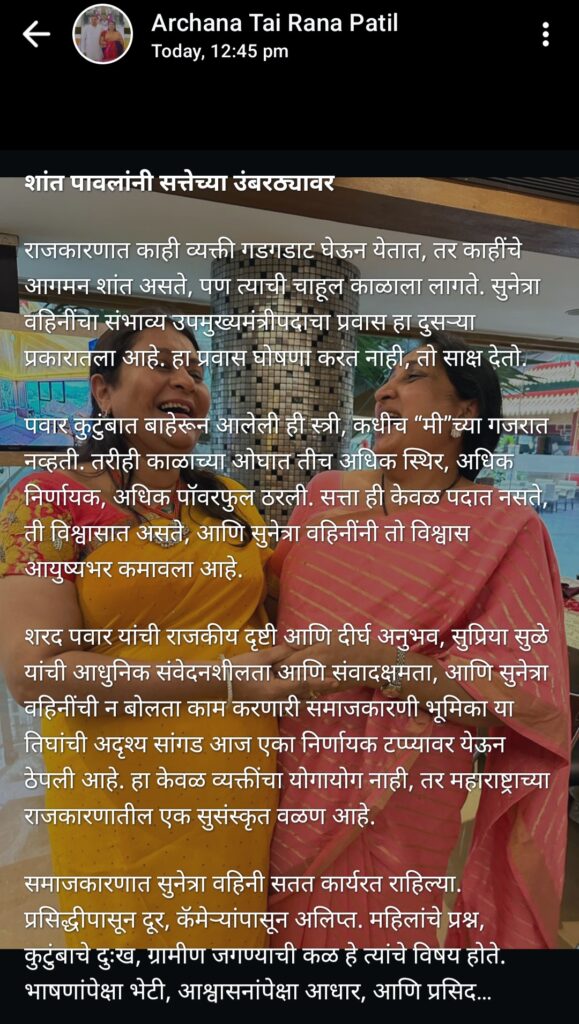राजकारणात काही व्यक्ती गडगडाट घेऊन येतात, तर काहींचे आगमन शांत असते, पण त्याची चाहूल काळाला लागते. सुनेत्रा वहिनींचा संभाव्य उपमुख्यमंत्रीपदाचा प्रवास हा दुसऱ्या प्रकारातला आहे. हा प्रवास घोषणा करत नाही, तो साक्ष देतो.