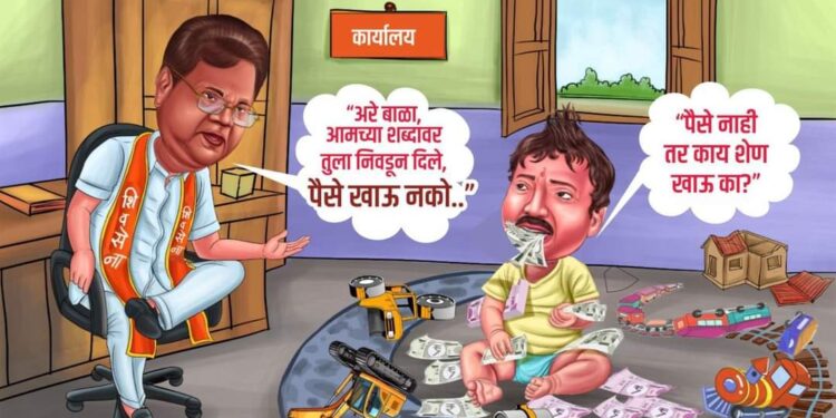 धाराशिव लोकसभेची निवडणुक रंगात आली असुन पंतप्रधान नरेंद्र मोदी यांच्या सभेपुर्वी मंत्री तानाजी सावंत व शिवसेना उबाठा गटाचे उमेदवार ओमराजे निंबाळकर यांचे कार्टून व्हायरल झाले आहे. सावंत यांचे पुतणे धनंजय सावंत यांनी एक कार्टून पोस्ट केले आहे. त्यात मंत्री सावंत असे सांगत आहेत की, अरे बाळा तुला आमच्या शब्दावर निवडून दिले आहे. पैसे खाऊ नकोस त्यावर ओमराजे हे पैसे नाही तर शेण खाऊ का ? असे उत्तर देताना कार्टूनमध्ये दाखवले आहे.