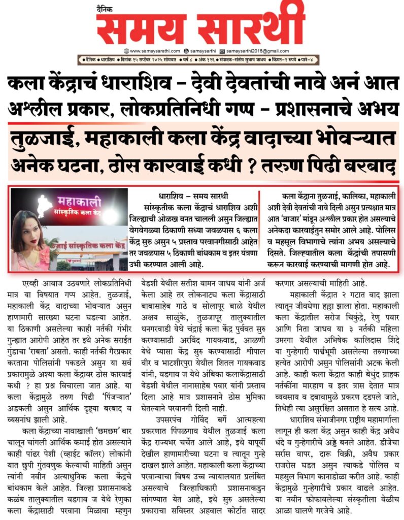 सांस्कृतीक कला केंद्राचं धाराशिव अशी जिल्ह्याची ओळख बनत चालली असुन जिल्ह्यात वेगवेगळ्या ठिकाणी सध्या जवळपास 6 कला केंद्र सुरु असुन 5 प्रस्ताव परवानगीसाठी आहेत तर जवळपास 5 ठिकाणी बांधकाम व इतर यंत्रणा उभी करण्यात आली आहे. कला केंद्राना तुळजाई, कालिका, महाकाली अशी देवी देवतांची नावे दिली असुन प्रत्यक्षात मात्र आत ‘बाजार’ मांडून अश्लील प्रकार होत असल्याचे अनेकदा कारवाईतुन समोर आले आहे. पोलिस व महसूल विभागाचे त्यांना अभय असल्याचे दिसते.