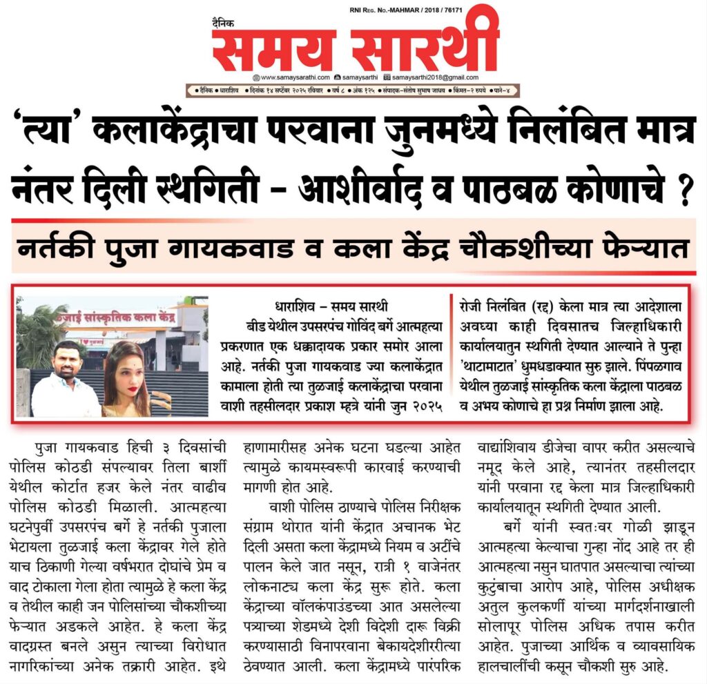 बीड येथील उपसरपंच गोविंद बर्गे आत्महत्या प्रकरणात एक धक्कादायक प्रकार समोर आला आहे. नर्तकी पुजा गायकवाड ज्या कलाकेंद्रात कामाला होती त्या तुळजाई कलाकेंद्राचा परवाना वाशी तहसीलदार प्रकाश म्हत्रे यांनी 17 जुन 2025 रोजी निलंबित(रद्द) केला मात्र त्या आदेशाला अवघ्या काही दिवसातच जिल्हाधिकारी कार्यालयातुन स्थगिती देण्यात आल्याने ते पुन्हा ‘थाटामाटात’ धुमधडाक्यात सुरु झाले. पिंपळगाव येथील तुळजाई सांस्कृतिक कला केंद्राला पाठबळ व अभय कोणाचे हा प्रश्न निर्माण झाला आहे.