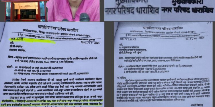 धाराशिव नगर परिषदेच्या 140 कोटी रुपयांच्या 59 रस्ते कामाच्या निविदा प्रक्रियेतील ठेकेदार अजमेरा व नगर परिषद मुख्याधिकारी यांच्यातील पत्र’व्यवहार’ समोर आला आहे. मुख्याधिकारी, ठेकेदार व नगर विकास विभाग यांच्यात झालेल्या पत्र व्यवहारात तत्कालीन मुख्याधिकारी यांची ‘वाटाघाटी’च्या एका पत्रावर चक्क वेगळी सही आहे. फड यांची नियमित पत्र व्यवहारावर सही एकसारखी असुन ठेकेदार याला दिलेल्या ‘वाटाघाटी’च्या पत्रावरील सही दुसरीच आहे. ही सही त्यांची की अन्य कोणी केली ? हे आता समोर गरजेचे आहे त्यासाठी चौकशीची मागणी होत आहे.