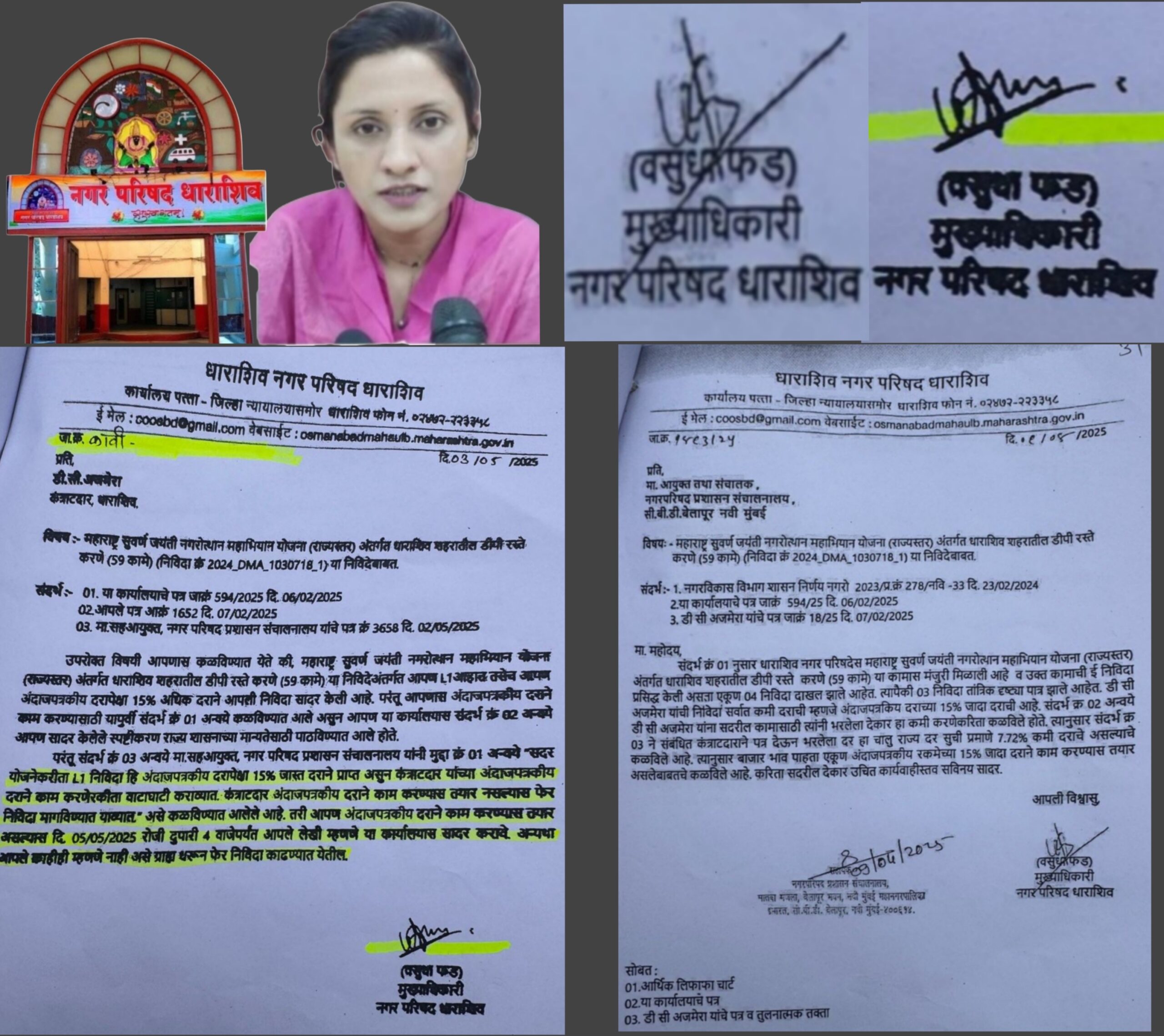 कंत्राटदार अजमेरा यांची निविदा 15 टक्के पेक्षा जास्त दराने प्राप्त असुन अंदाजपत्रकीय दराने काम करणेरकीता वाटाघाटी कराव्यात. कंत्राटदार अंदाजपत्रकीय दराने काम करण्यास तयार नसल्यास फेर निविदा मागविण्यात याव्यात, असे पत्र नगर परिषद प्रशासन संचालनालय यांनी वसुधा फड यांना 2 मे रोजी दिले होते. त्याच्या आधारे 3 मे ला फड यांनी अजमेरा यांना पत्र काढले त्यानुसार, आपण अंदाजपत्रकीय दराने काम करण्यास तयार असल्यास 5 मे सोमवारी दुपारी 4 वाजेपर्यंत आपले लेखी म्हणणे या कार्यालयास सादर करावे. अन्यथा आपले काहीही म्हणणे नाही असे ग्राह्या धरून फेर निविदा काढण्यात येतील. इतक्या महत्वाच्या पत्रावर सही चक्क वेगळी असुन जावक क्रमांक नसल्याने संशय वाढला आहे. 3 मे रोजी त्या महिन्यातील पहिला शनिवार होता, सुट्टीच्या त्या दिवसातील घडामोडीची चौकशी होणे गरजेचे आहे.