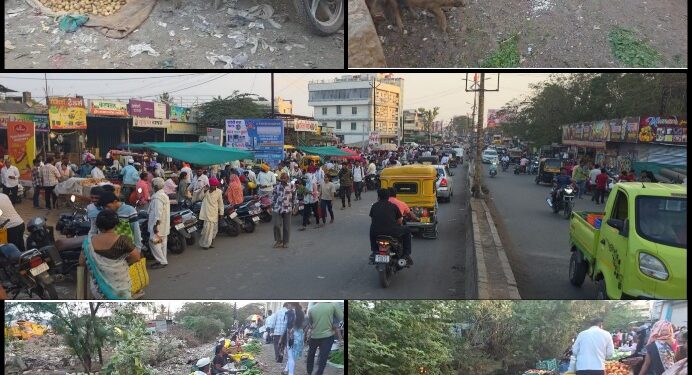 आठवडी बाजारात भाजी फळे विक्री करण्यासाठी जागा राखीव केली असुन तिथे सिमेंटचे कट्टे सुद्धा बांधले आहेत मात्र तिथे ठरवून दिलेल्या जागी भाजी न विकता विक्रेते रस्त्यावर भाजी फळे विकत असल्याने मुख्य रस्त्यावर वाहतुकीची कोंडी होत असुन अडथळा होत आहे. आतील बाजार मैदान मोकळे तर रस्त्यावर बाजार अशी स्तिथी आहे. रस्त्यावर फळ गाडे लावल्याने वाहन चालवणे अवघड जात असुन अपघाताचे व वादाचे प्रमाण वाढत आहे, यां भागातील हॉटेल, दुकानेसमोर भाजी विकली जात आहे. ठरवून दिलेल्या जागी बाजार भरल्यास रस्त्यावरची गर्दी कमी होऊ शकते मात्र नगर परिषदेने याकडे लक्ष देणे गरजेचे आहे, इथे नियोजनाचा आभाव जाणवतो.