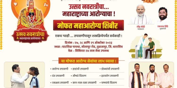 उत्सव नवरात्रीचा महाराष्ट्राच्या आरोग्याचा,एकच ग्वाही, तपासणीपासुन शस्त्रक्रियेपर्यंत सर्वकाही असा नारा देत आरोग्यमंत्री डॉ तानाजीराव सावंत यांच्या संकल्पनेतून व पुढाकारातून तुळजाभवानी नवरात्र उत्सवात 27 ते 29 ऑक्टोबर या काळात 3 दिवसांचे महाआरोग्य शिबिराचे आयोजन करण्यात आले आहे. राज्य सरकारच्या सार्वजनिक आरोग्य विभाग आयुष्यमान भव अंतर्गत महाआरोग्य शिबिराची तयारी पुर्ण झाली असुन उदघाट्न 27 ऑक्टोबर रोजी मान्यवर यांच्या हस्ते होणार आहे.