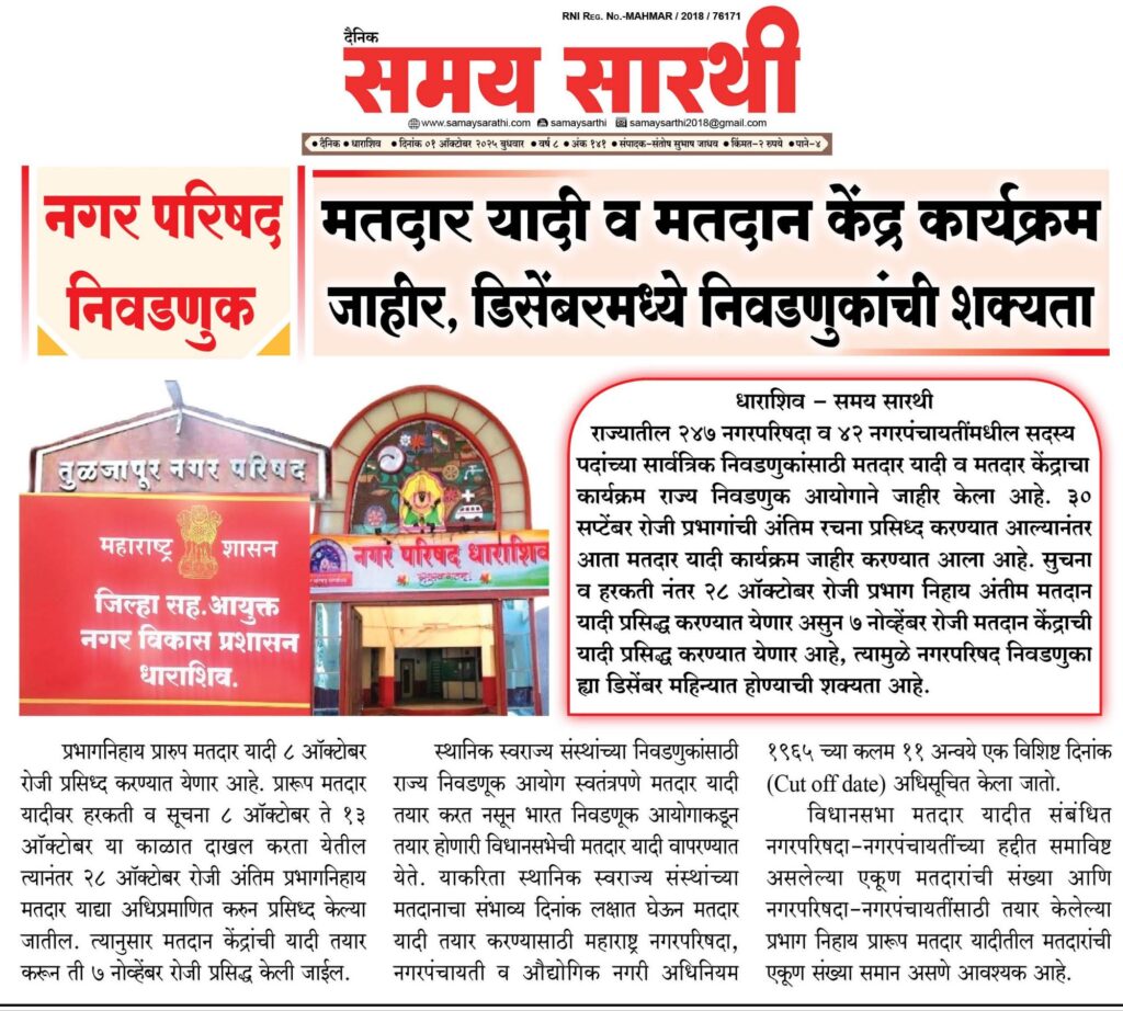 राज्यातील 247 नगरपरिषदा व 42 नगरपंचायतींमधील सदस्य पदांच्या सार्वत्रिक निवडणुकांसाठी मतदार यादी व मतदार केंद्राचा कार्यक्रम राज्य निवडणुक आयोगाने जाहीर केला आहे. 30 सप्टेंबर रोजी प्रभागांची अंतिम रचना प्रसिध्द करण्यात आल्यानंतर आता मतदार यादी कार्यक्रम जाहीर करण्यात आला आहे. सुचना व हरकती नंतर 28 ऑक्टोबर रोजी प्रभाग निहाय अंतीम मतदान यादी प्रसिद्ध करण्यात येणार असुन 7 नोव्हेंबर रोजी मतदान केंद्राची यादी प्रसिद्ध करण्यात येणार आहे, त्यामुळे नगरपरिषद निवडणुका ह्या डिसेंबर महिन्यात होण्याची शक्यता आहे.