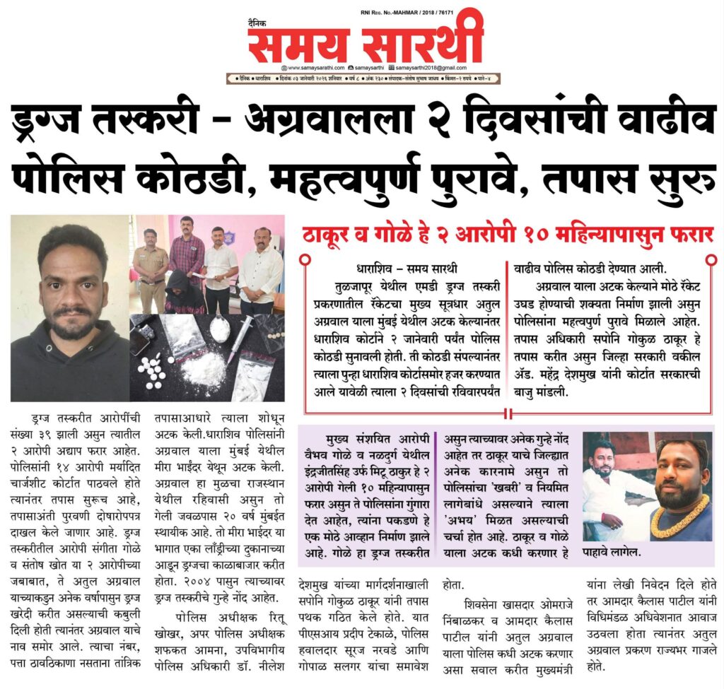 धाराशिव पोलिसांनी अग्रवाल याला मुंबई येथील मीरा भाईंदर येथून अटक केली. अग्रवाल हा मुळचा राजस्थान येथील रहिवासी असुन तो गेली जवळपास 20 वर्ष मुंबईत स्थायीक आहे. तो मीरा भाईदर या भागात एका लॉंड्रीच्या दुकानाच्या आडून ड्रग्जचा काळाबाजार करीत होता. 2004 पासुन त्याच्यावर ड्रग्ज तस्करीचे गुन्हे नोंद आहेत.
