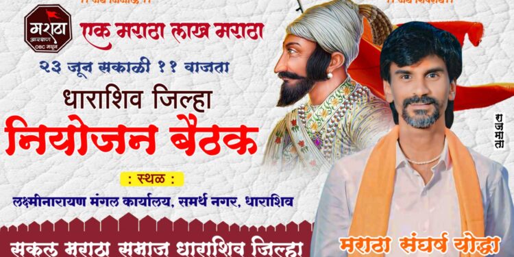 मराठा संघर्ष योद्धा मनोज जरांगे पाटील यांनी शांतता रॅलीची घोषणा केली असुन 10 जुलै रोजी जरांगे पाटील हे धाराशिव जिल्ह्यात येत आहेत. या शांतता रॅलीच्या नियोजनासाठी 23 जुन रोजी सकाळी 11 वाजता धाराशिव जिल्हा नियोजन बैठक समर्थ नगर येथील लक्ष्मीनारायण मंगल कार्यालयात होणार असुन याला उपस्थितीत राहावे असे आवाहन सकल मराठा समाजाच्या वतीने करण्यात आले आहे.