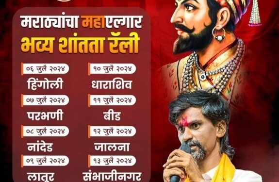 मराठा समाजाला सरसकट आरक्षण मिळावे या मागणीसाठी मनोज जरांगे पाटील यांनी शांतता रॅलीची घोषणा केली आहे. आमरण उपोषण नंतर त्यांनी या रॅलीची घोषणा केली असुन 6 जुलै रोजी हिंगोली पासुन या रॅलीला सुरुवात होणार आहे. 7 जुलै परभणी, 8 जुलै नांदेड, 9 जुलै लातूर, 10 जुलै धाराशिव, 11 जुलै बीड,12 जुलै जालना व 13 जुलै रोजी छत्रपती संभाजीनगर येथे शांतता रॅली निघणार आहे, या रॅलीचे नियोजन करण्यासाठी मराठा समाजाने सुरुवात केली आहे. जिल्ह्यातील सर्व मराठा एका ठिकाणी एकत्र येणार आहे, कोणीही विखरून थांबणार नाही असे मनोज जरांगे यांनी सांगितले.