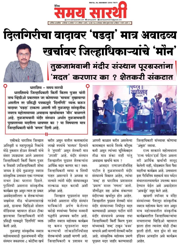 धाराशिवचे जिल्हाधिकारी किर्ती किरण पुजार यांनी डान्स व्हिडीओ प्रकरणात जर कोणाच्या ‘भावना’ दुखावल्या असतील तर प्रसिद्धी पत्रकाद्वारे ‘दिलगिरी’ व्यक्त करून वादावर ‘पडदा’ टाकला होत मात्र तुळजापूर सांस्कृतीक नवरात्र महोत्सवाच्या अवाढव्य खर्चाबाबत ‘मौन’ बाळगले होते. तुळजाभवानी मंदीर संस्थान अर्थात तुळजाभवानी पुरग्रस्ताच्या मदतीला धावणार का ? या विषयाला मात्र जिल्हाधिकारी यांनी बगल दिली होती, याबाबत दैनिक समय सारथीने वृत्त प्रसिद्ध केले होते. शेतकरी यांनी सुद्धा मदतीची अपेक्षा व्यक्त केली होती.